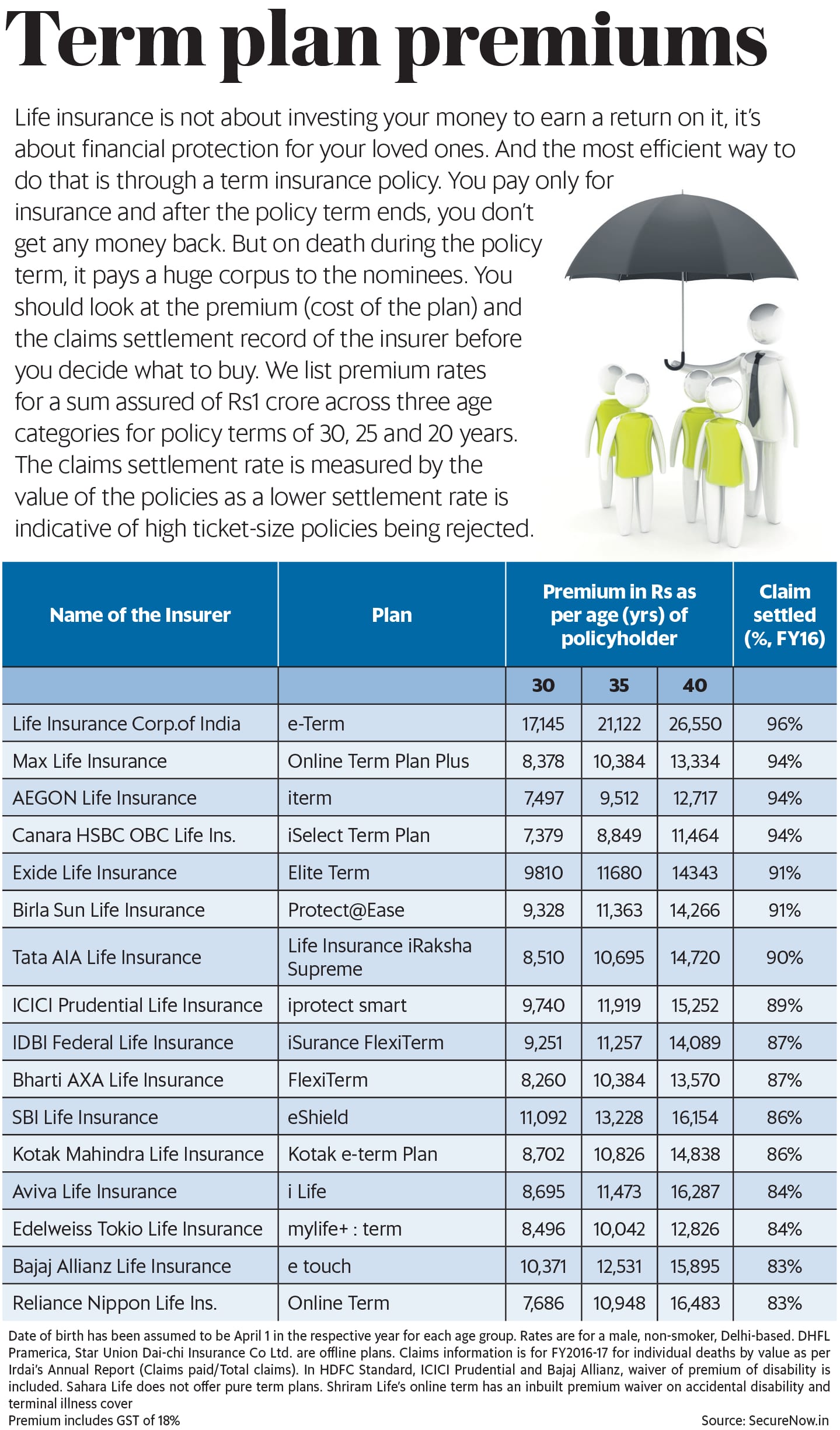 Further, there are many types of term plan to choose from and you can read this piece to understand the universe of term plans. You should look at the premium (cost of the term plan) and the claims settlement record of the insurer before you decide what to buy. To help you do just here the premium rates for a sum assured of Rs1 crore across three age categories for a pure term insurance policy. Policy terms are 30, 25 and 20 years, respectively. The claims settlement rate is measured by value of the policies as a lower settlement rate is indicative of high ticket size policies being rejected.